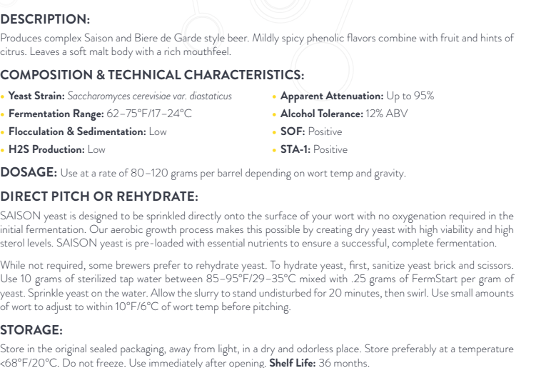 SAISON yeast is designed to be sprinkled directly onto the surface of your wort with no oxygenation required in the initial fermentation. Our aerobic growth process makes this possible by creating dry yeast with high viability and high sterol levels. SAISON yeast is pre-loaded with essential nutrients to ensure a successful, complete fermentation. While not required, some brewers prefer to rehydrate yeast. To hydrate yeast, first, sanitize the yeast brick and scissors. Use 10 grams of sterilized tap water between 29-35°C mixed with 0.25 grams of FermStart (Yeast Nutrient) per gram of yeast. Sprinkle yeast on the water. Allow the slurry to stand undisturbed for 20 minutes, then swirl. Use small amounts of wort to adjust to within 10°F (6°C) of wort temperature before pitching. Ferment between 17-24°C.